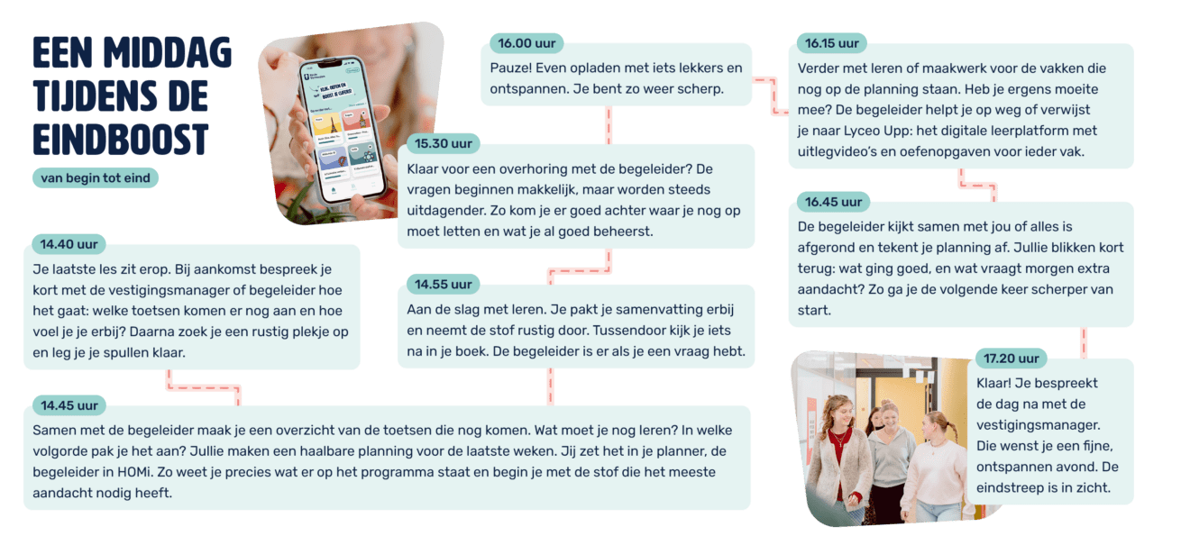Afhankelijk van de gekozen begeleiding werken we aan studievaardigheden zoals plannen, structureren en herhalen en is er ruimte om inhoudelijke vragen te stellen over de leerstof. Dit doen we volgens onze Lyceo Leren Leren©-methode, ontwikkeld samen met Tilburg University.Focus op de toetsweek